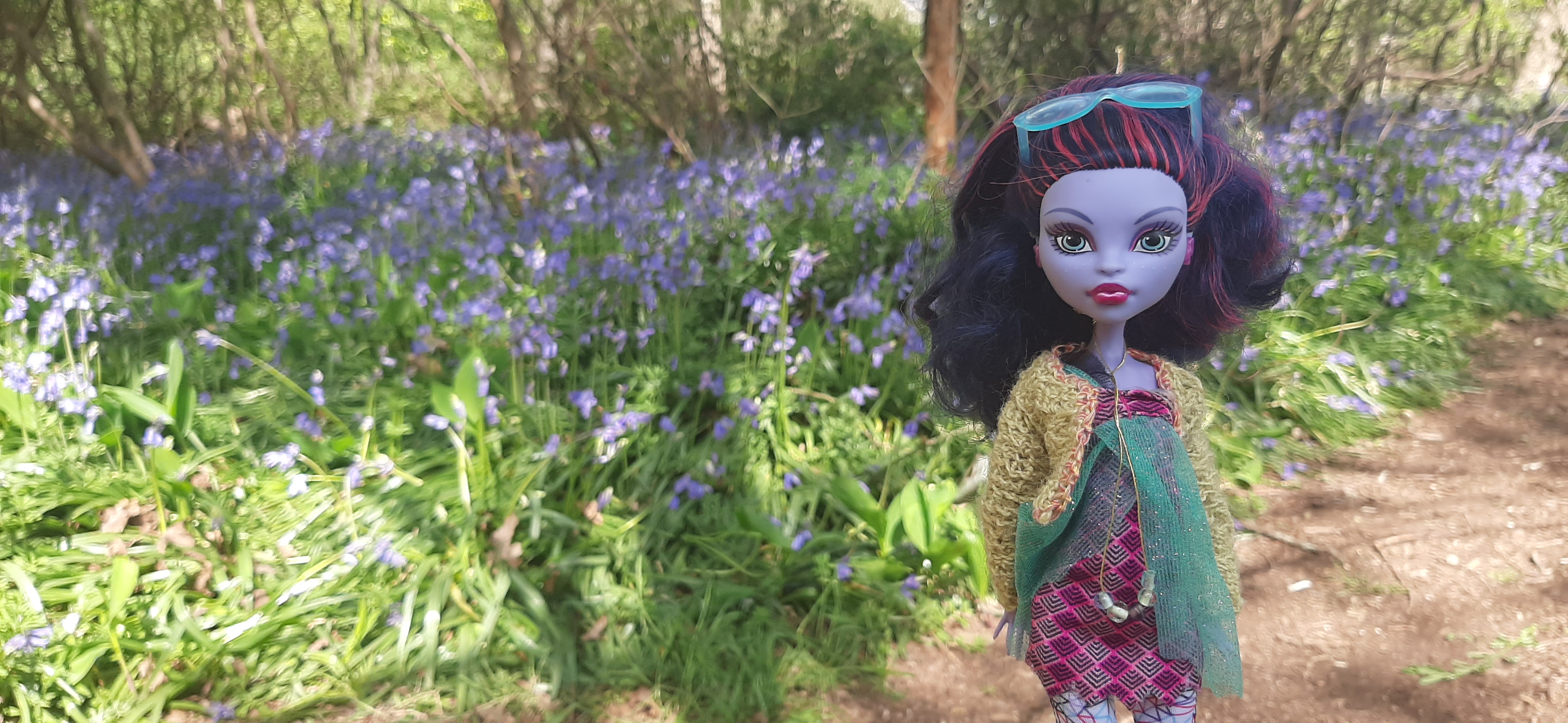 My model today is a Monstar High doll Jane Boolittle - adorable Amazon forest beauty today in borrowed friends' clothes, handmade cardigan, pendant and Liv studs....